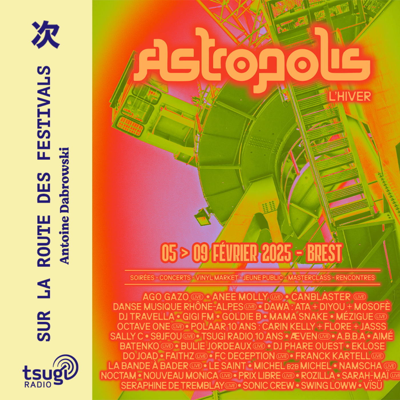C’est notre visite annuelle dans le Finistère et c’est un grand plaisir chaque année de retrouver les équipes d’Astropolis et de la Carène à Brest. Plaisir aussi de se promener dans cette programmation unique en son genre qui célèbre les musiques électroniques dans toute leur richesse et leur ouverture sur le monde. À l’image de notre programme de ce soir : à notre micro le duo mythique de Detroit, Octave One, le trio ligérien-togolais, Ago Gazo, la Franco-Italienne Gigi FM, la révélation Nouveau Monica avec son génial live garage breaké qu’on va vous diffuser en fin d’émission un peu après 23h, la queen de la bass music en France, Flore, et le magicien du modulaire Canblaster. Et puis cette soirée, est un peu spéciale pour nous à Tsugi Radio. En octobre 2025, Tsugi Radio aura 10 ans, c’est complètement fou.