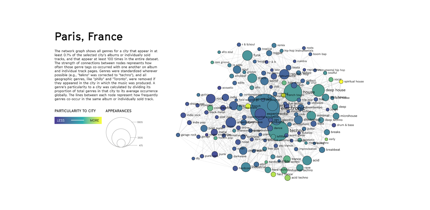 Il faut savoir que sur Bandcamp, chaque utilisateur peut taguer le genre musical de son choix, et donc donner sa propre définition de la musique qu’il produit. À l’inverse de Spotify où les genres sont prédéfinis par la plateforme et sont souvent cantonnés aux plus répandus (« rock », « pop », « rap », « techno », etc…). On trouve donc sur Bandcamp une variété de genres nouveaux, tout plein de sous-genres en phase avec les mutations musicales de notre époque, dont parmi eux « ambient drone », « full on », « cyberpunk » ou « speed metal »… Encore plus intéressant, les genres qui sont propres à certaines villes comme « germany » à Mexico City ou « spiritual house » à Paris (et oui), qui apparaissent en jaune sur la carte.